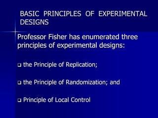 This allows us to equalize the effects of unknown or uncontrollable sources of variation. Fisher there are three types of basic principle of experimental design.